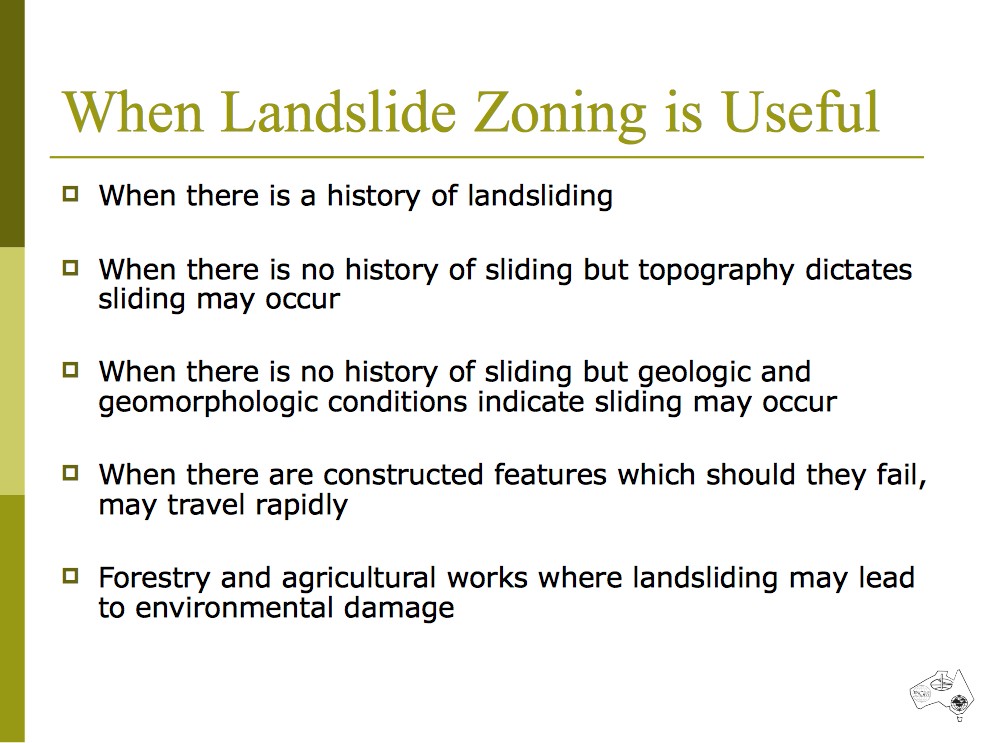 There are many situations when landslide zoning is potentially an issue in land use planning.