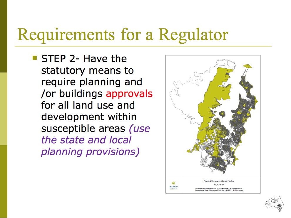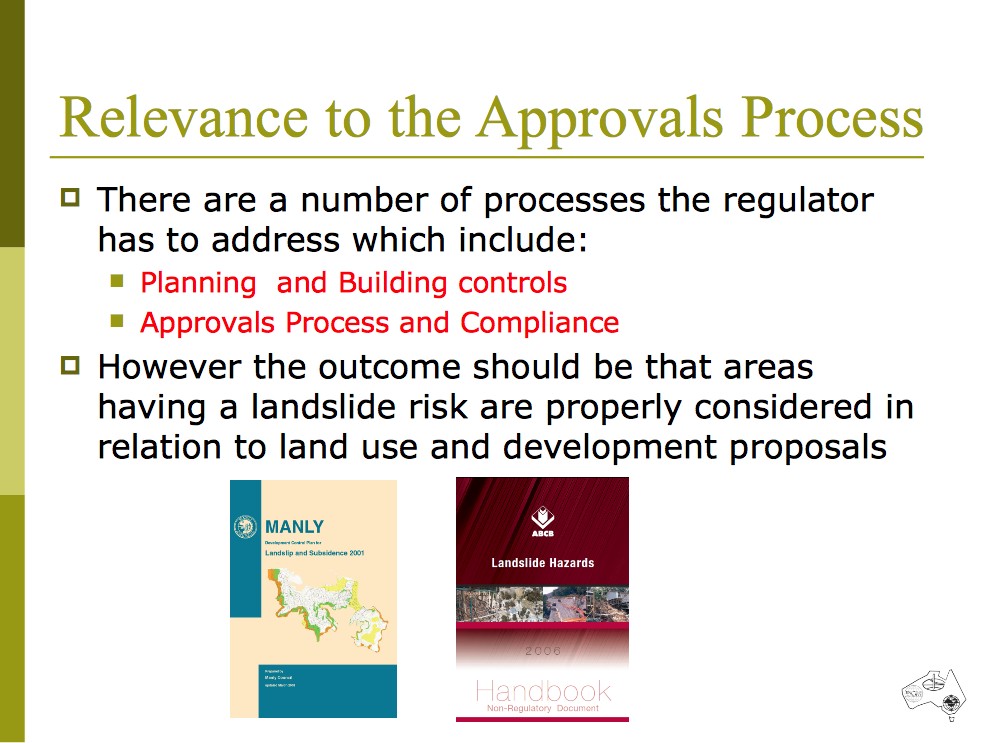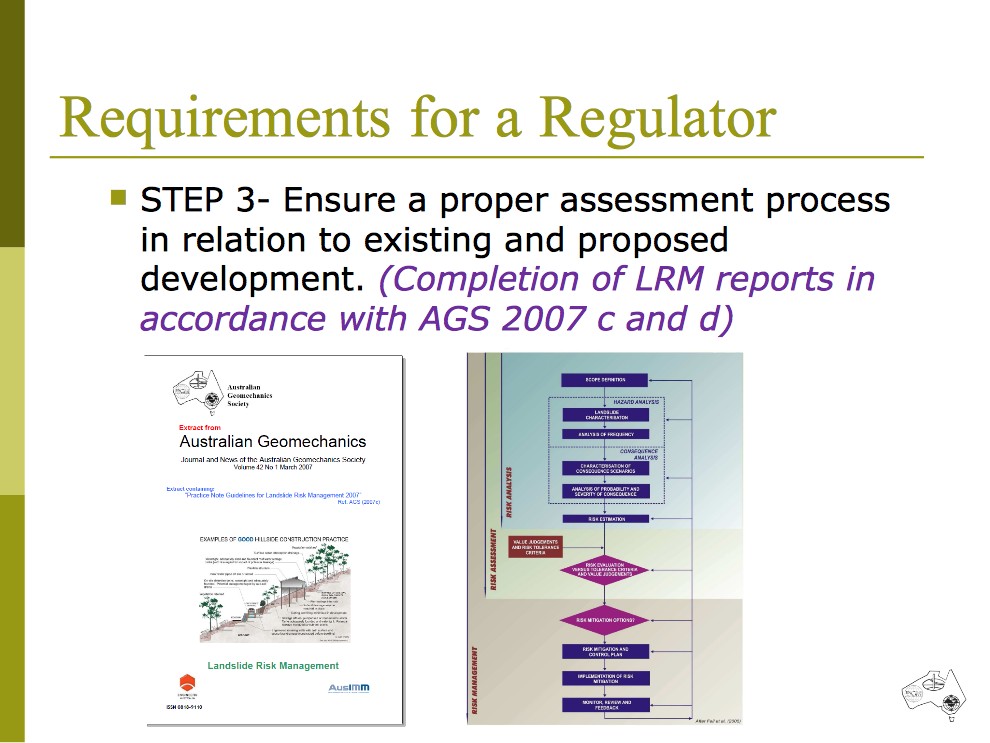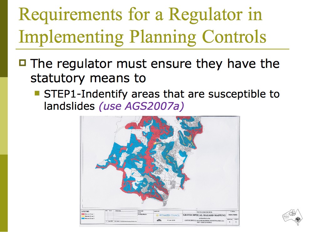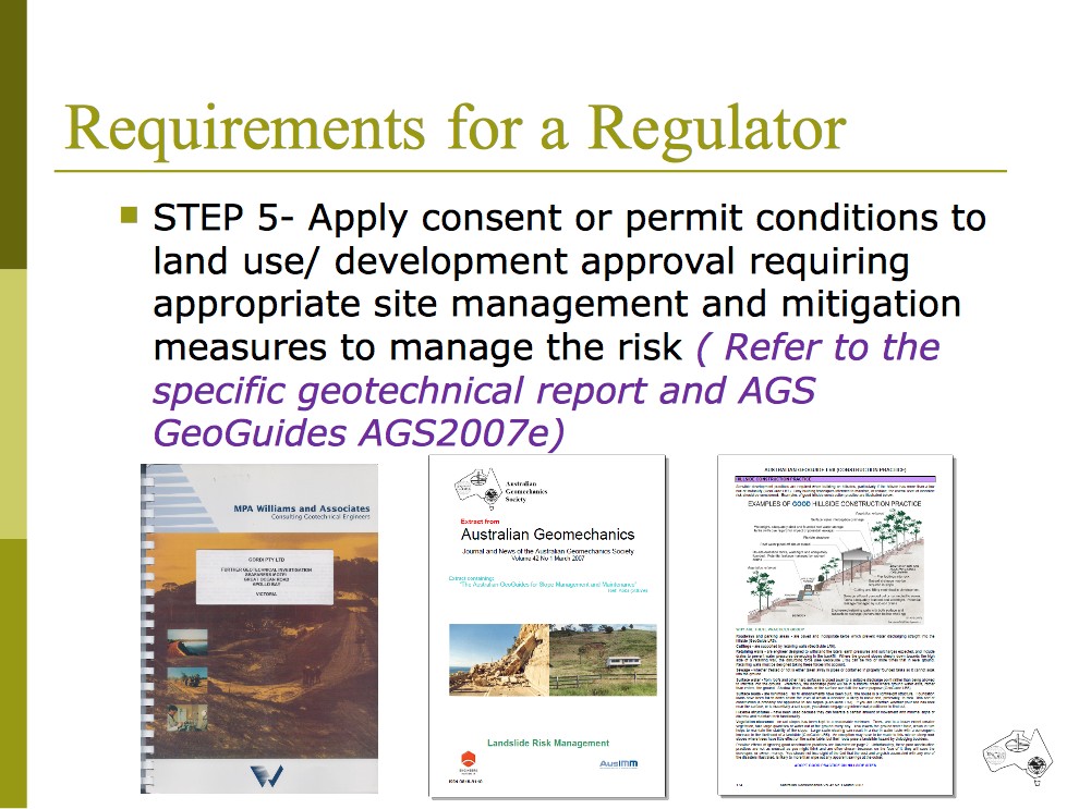 The format of the module is for a series of Questions relating to the understanding required by the Regulator in respect to a number of aspects relating to the implementation of a landslide-zoning scheme, policy requirements and the approvals process.