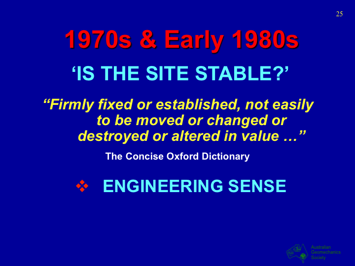 Fell (1992) provides a regional overview of land instability in Australia, which describes the location and extent of landslides and the conditions and mechanisms which are conducive to slope failure. Most landslides in Australia occur in Tertiary basalt, Tertiary and Cretaceous sediments and older inter-bedded sedimentary and coal measure formations (Fell 1992). Maps which show the distribution of such materials for New South Wales, Victoria, southern Queensland and Tasmania, along with a comprehensive bibliography, are also provided in Fell (1992). Further information is provided by Johnson and others (1995), Michael-Leiba (1999), Michael-Leiba and others (1997), Blong and Coates (1987) and AGS (2007).