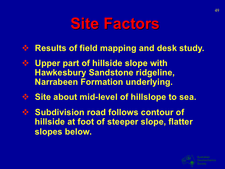 Refer to Australian GeoGuides (AGS 2007e) and the suite AGS (2007), as well as your local Council. Every Council in Australia was provided with a copy of AGS (2007) in both hard and soft copy.